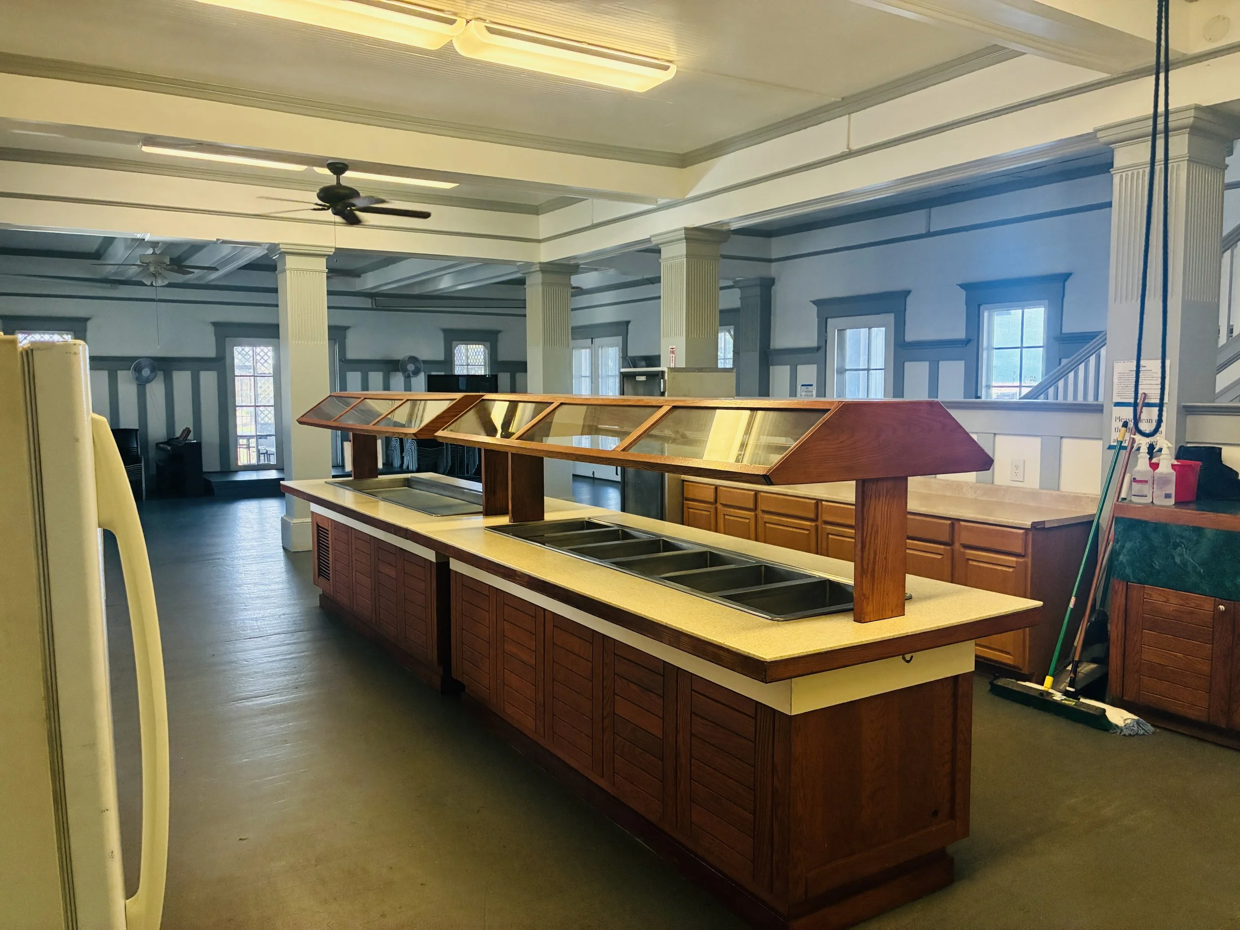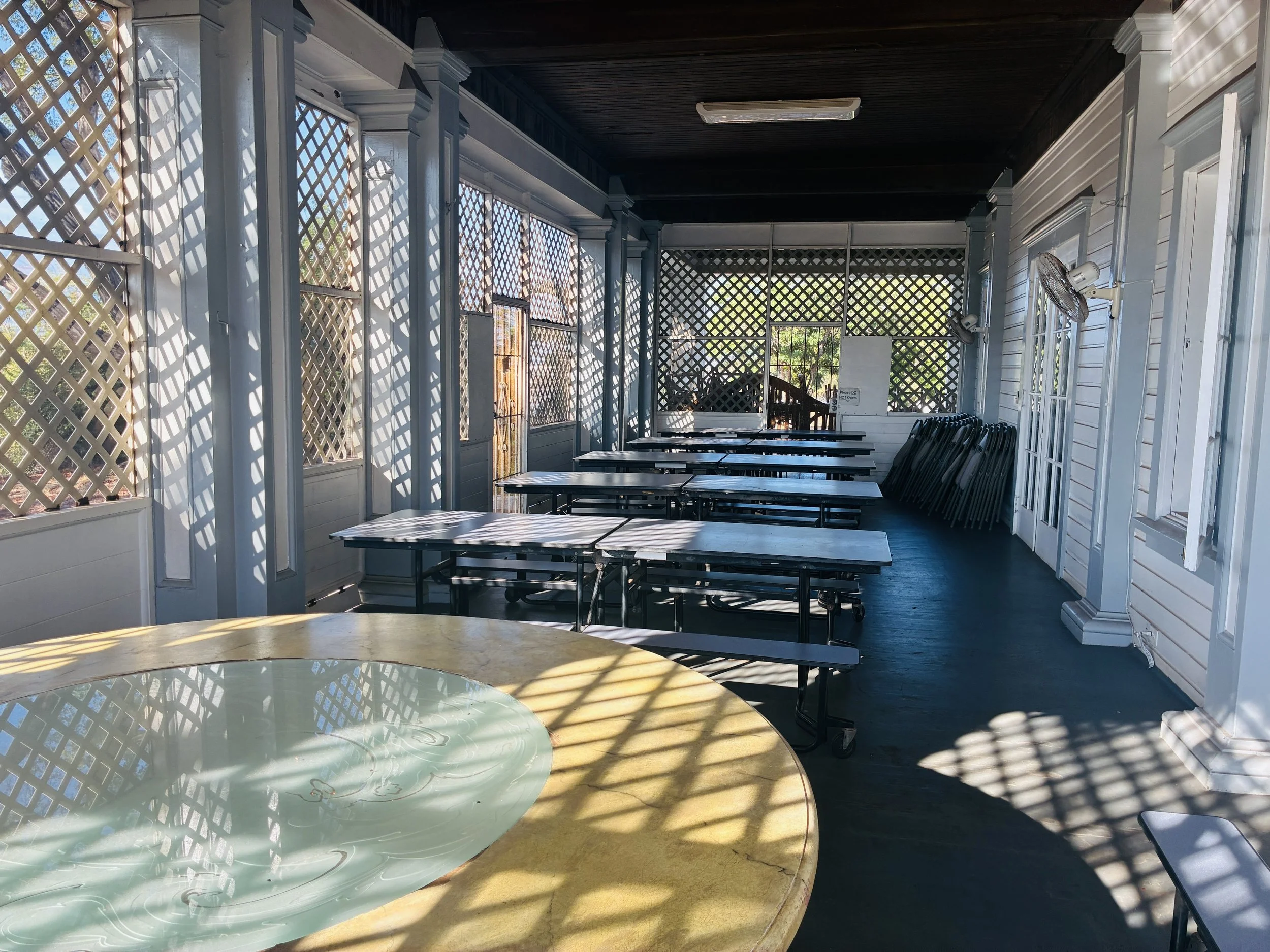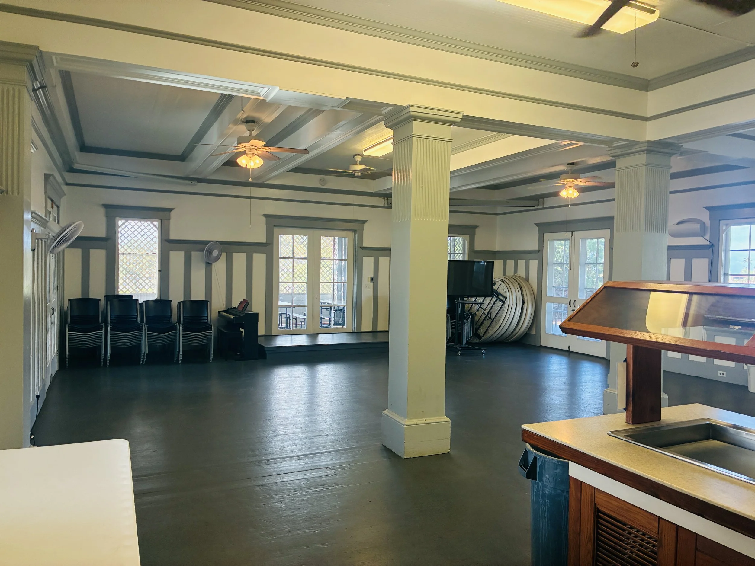 Plantation Hale 1st floor is our main meeting space located in the Plantation Hale. It has the capacity to accommodate around 100 people. There are multiple areas for use in this space. There is a food serving area that has a hot/cold buffet bar, guest refrigerator, and large counter. An open dining/meeting space with a small stage, 2 projector screens, round tables, and chairs. A screened in back/ side porch and a covered front porch with more tables for dining.