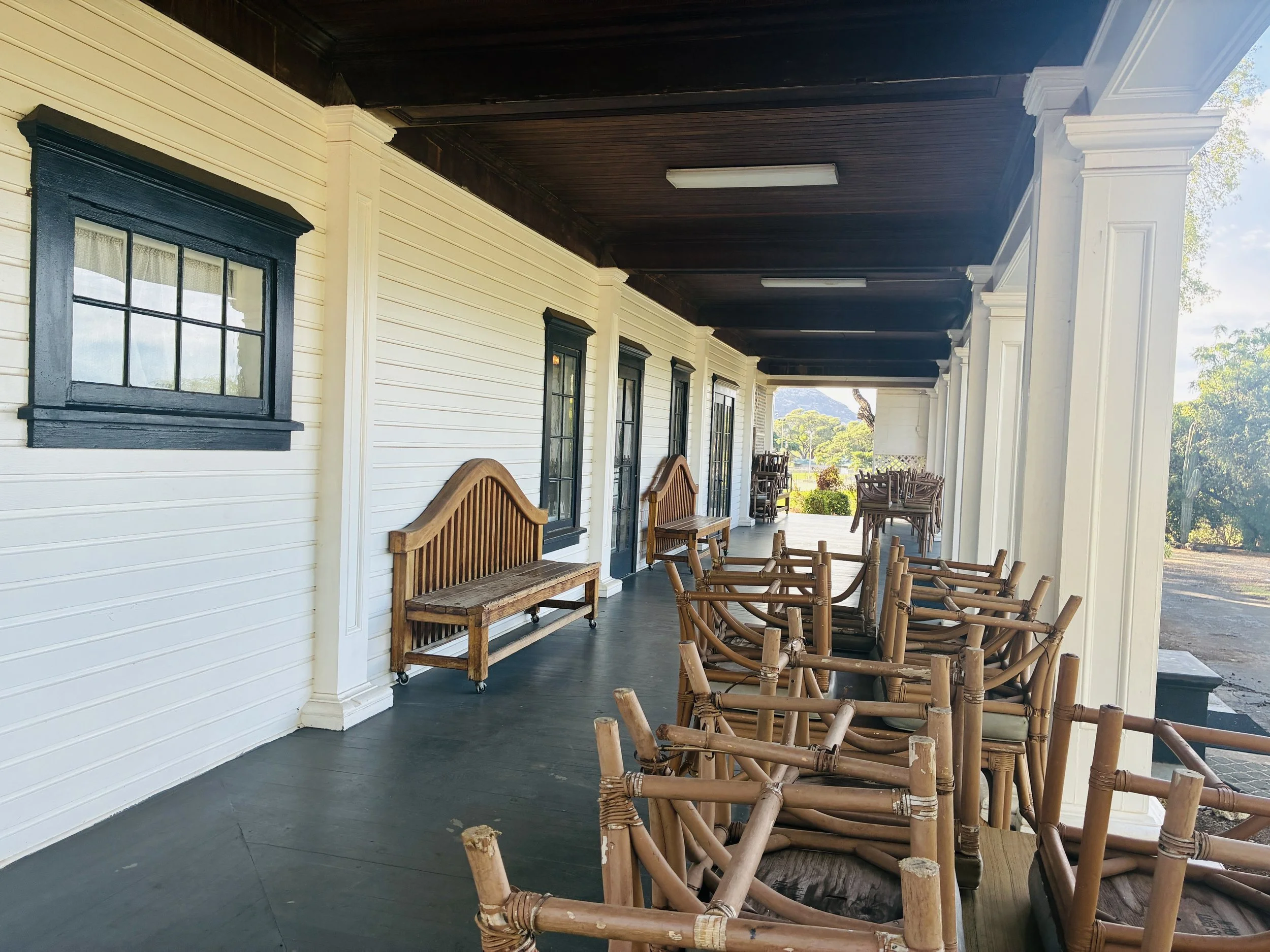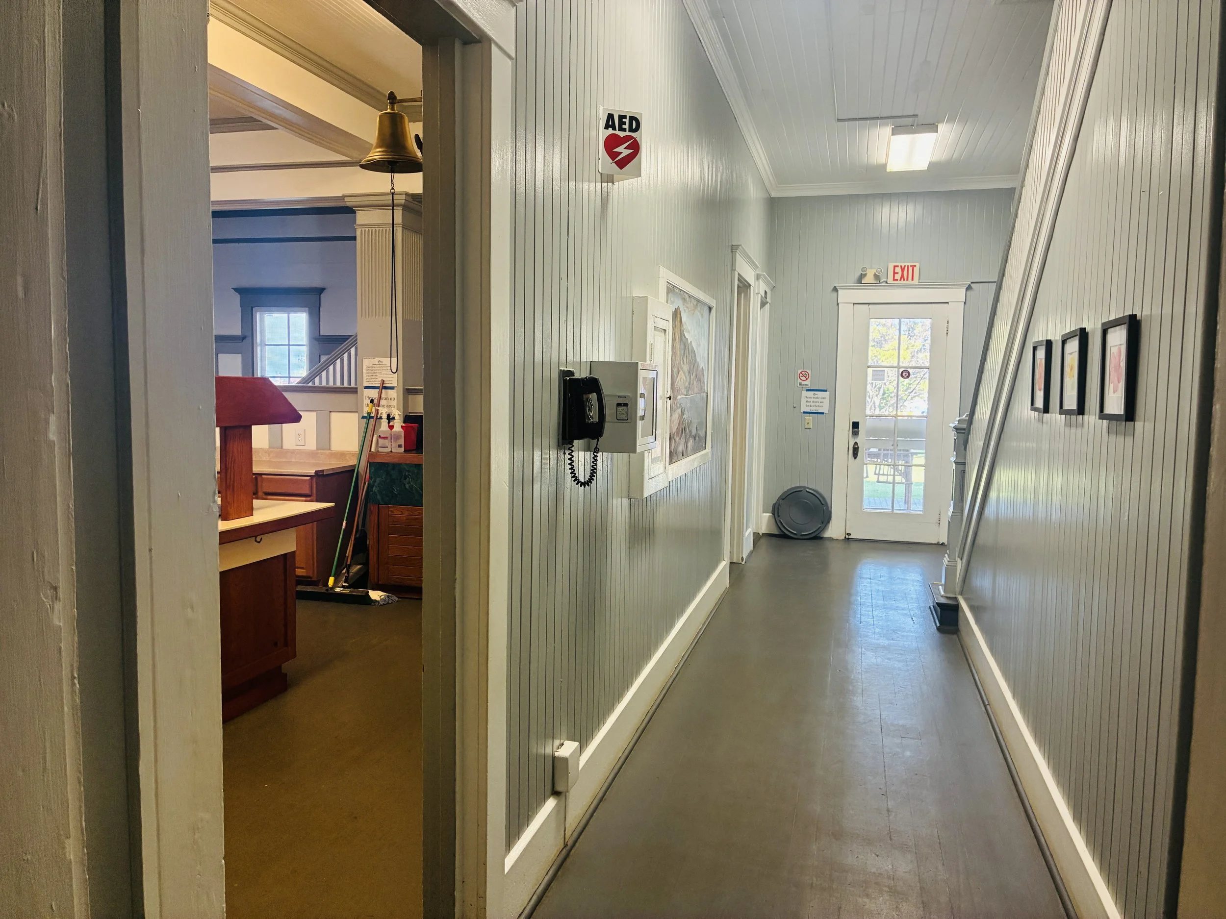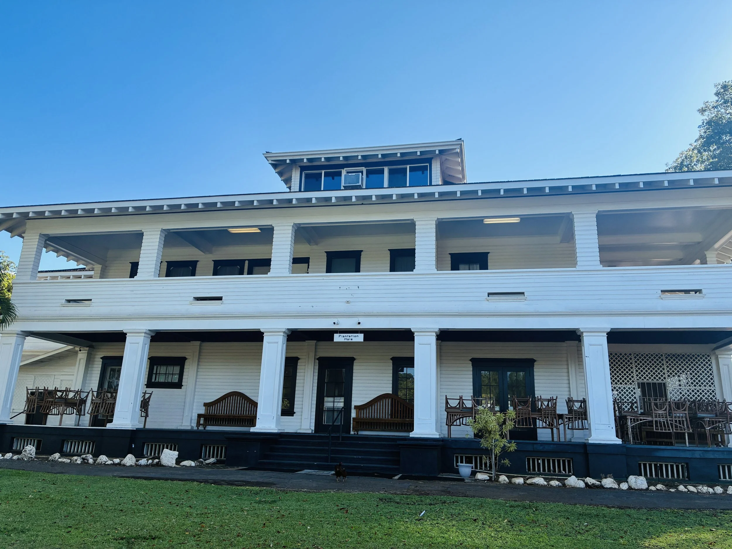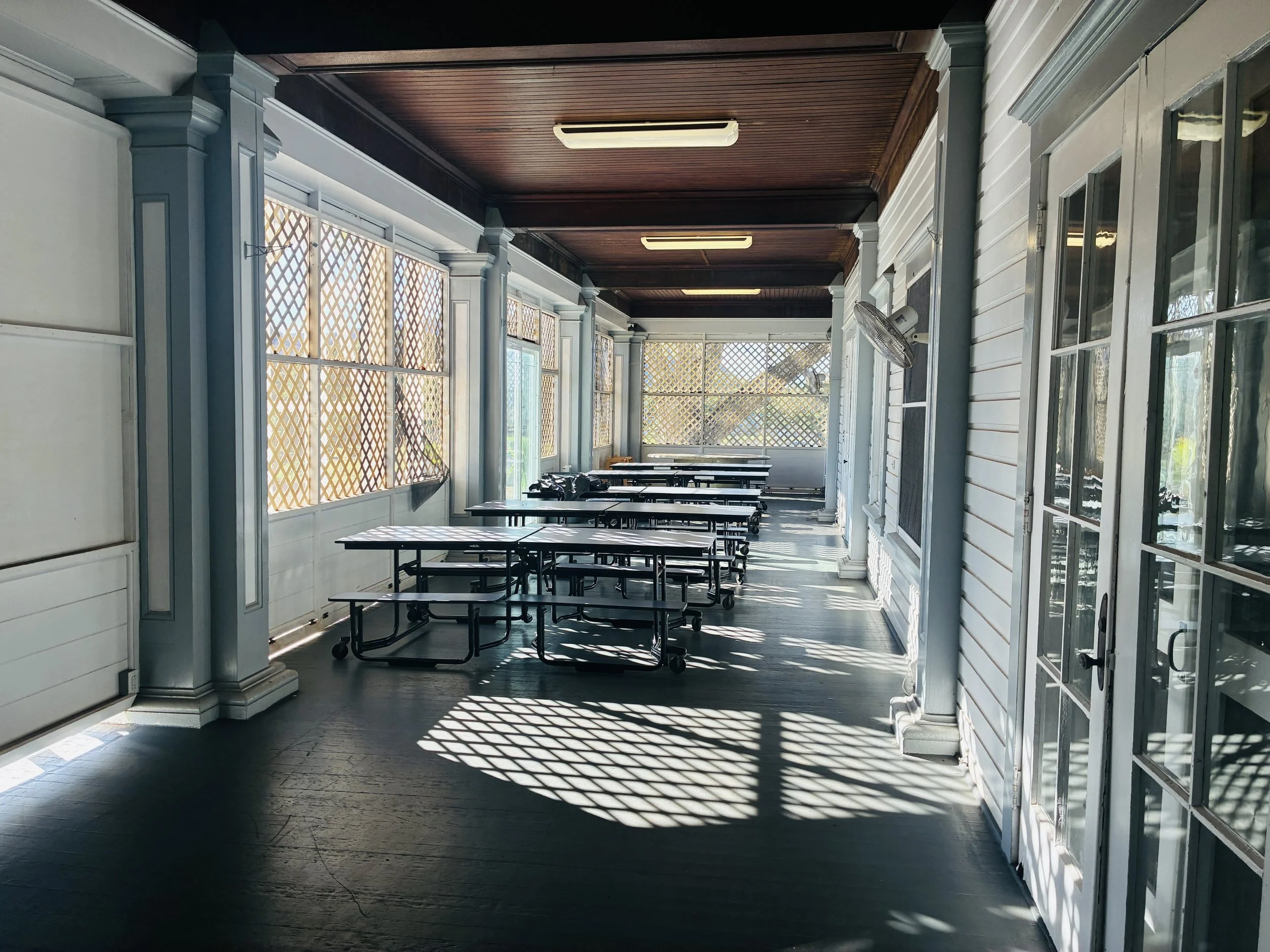 Plantation Hale 1st floor is our main meeting space located in the Plantation Hale. It has the capacity to accommodate around 100 people. There are multiple areas for use in this space. There is a food serving area that has a hot/cold buffet bar, guest refrigerator, and large counter. An open dining/meeting space with a small stage, 2 projector screens, round tables, and chairs. A screened in back/ side porch and a covered front porch with more tables for dining.