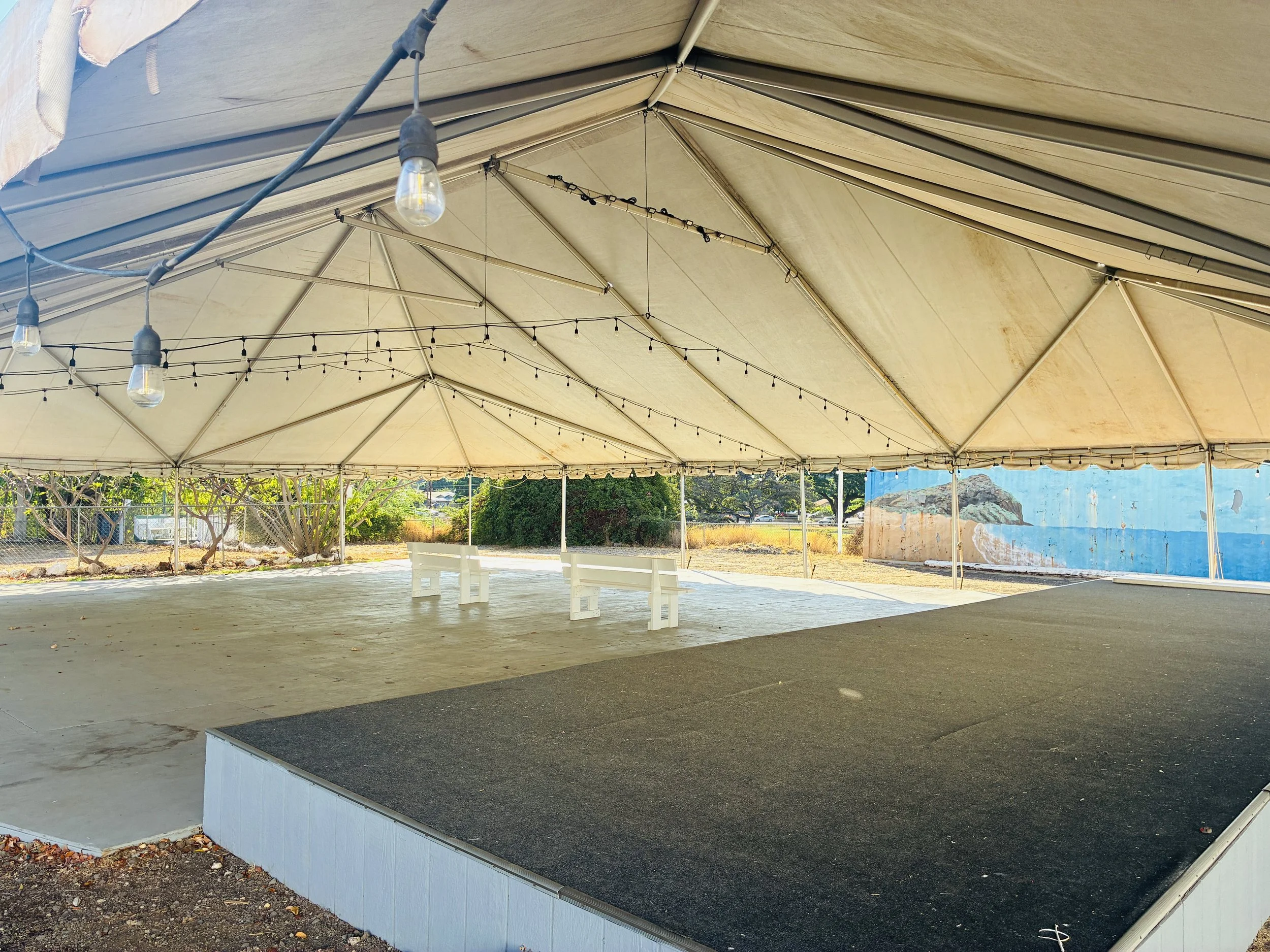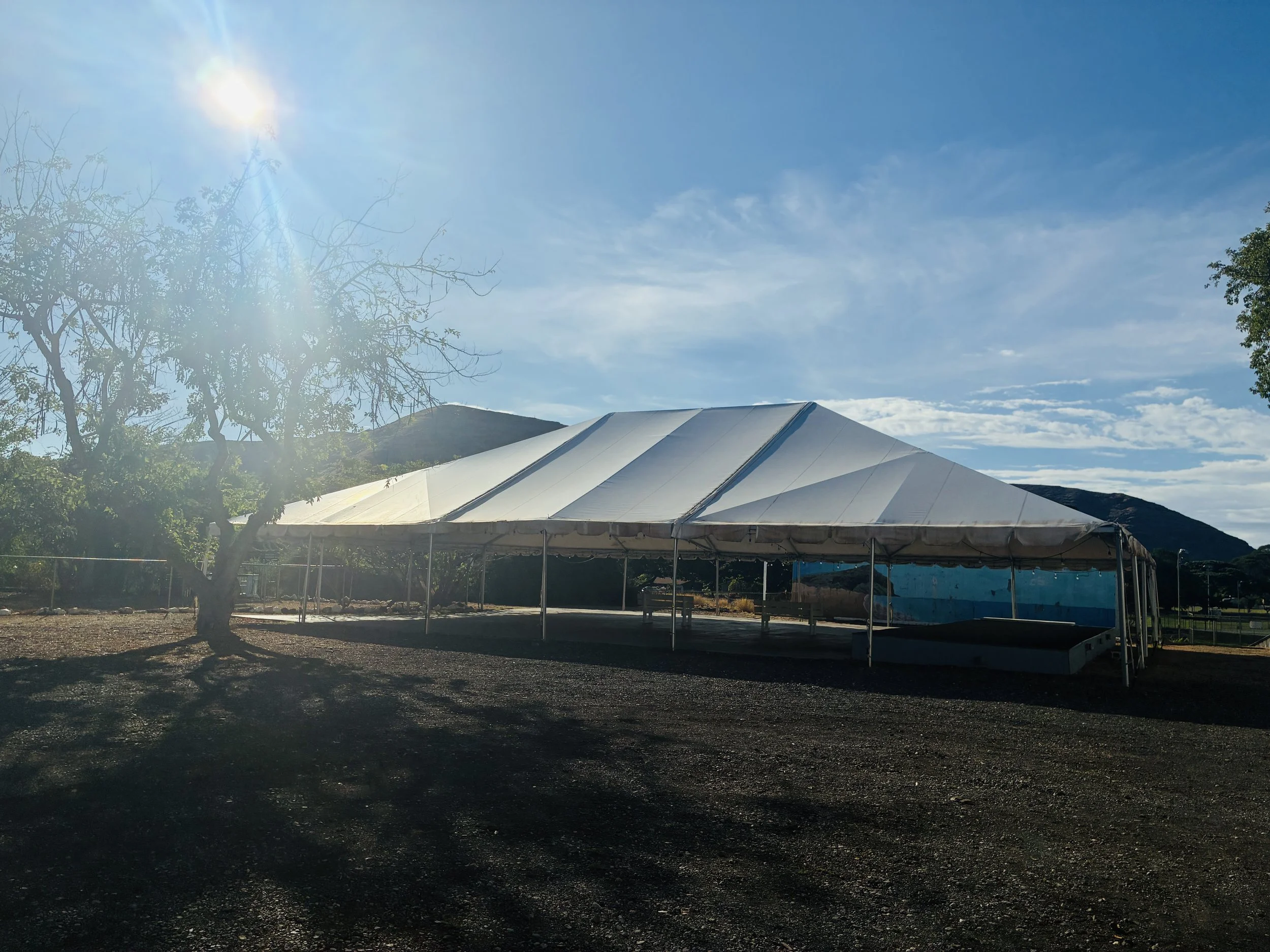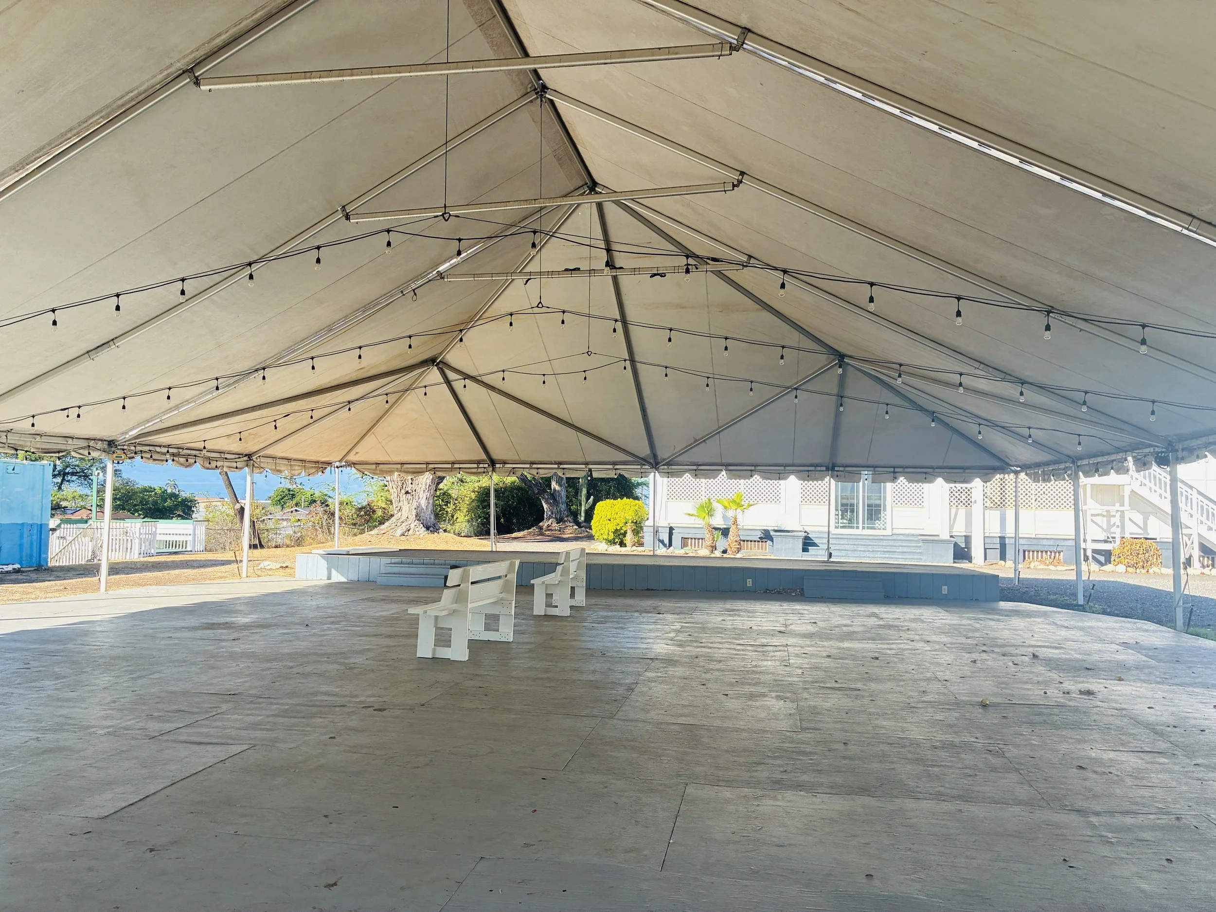 We have a large tent with wood floor behind the Plantation Hale that fit about 200 people. There is a large stage, electrical outlets, spotlights, and string lights around the tent. Many groups use the tent for worship and parties. Additionally there are 2 outdoor bathrooms near the tent.